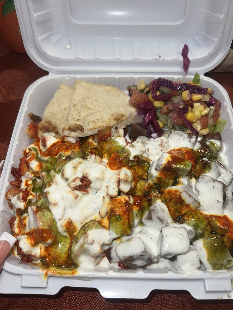 Chicken over Rice: A classic favorite, this dish combines perfectly seasoned chicken with fluffy rice and a side of creamy white sauce that elevates every bite. It’s a must-try for anyone who loves flavorful comfort food.